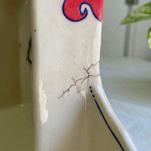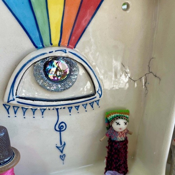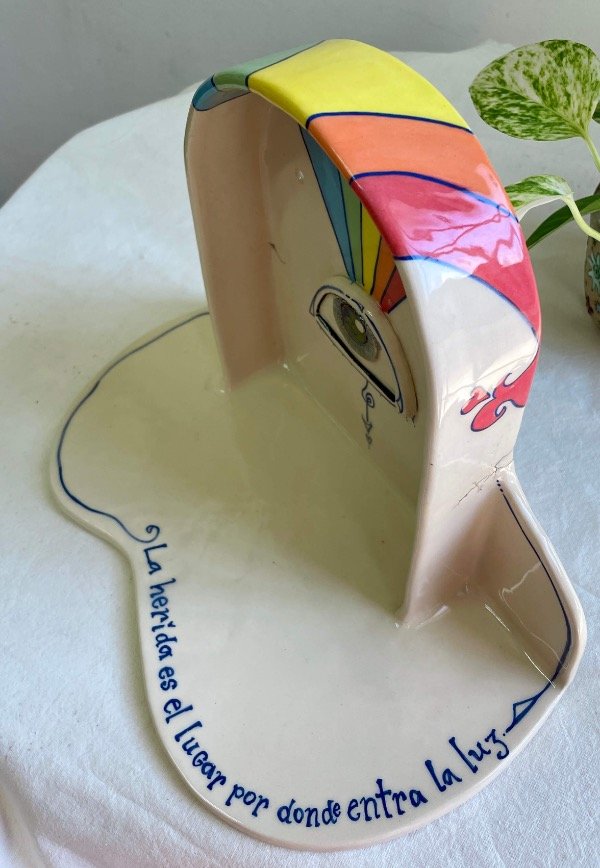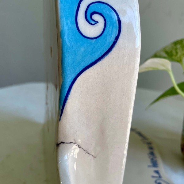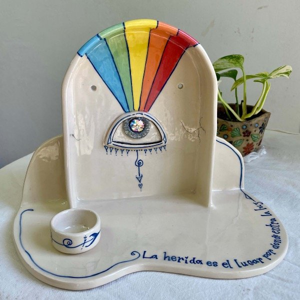 Altar cerámica pintado a mano con engobes, esmalte y lustre tornasolado.
