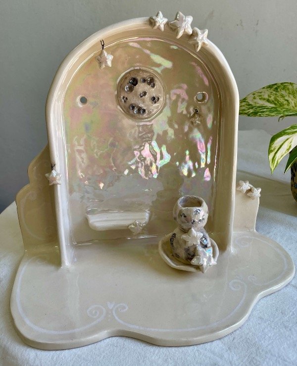 Altar cerámica decorado con engobe blanco, esmalte y lustre tornasolado.