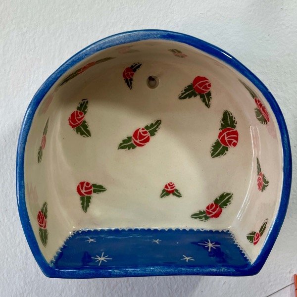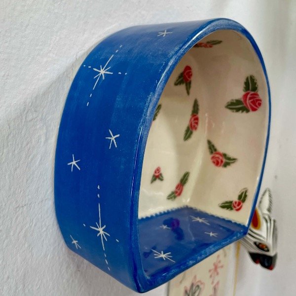 Realizado en cerámica, pintado a mano con engobes y esmalte.