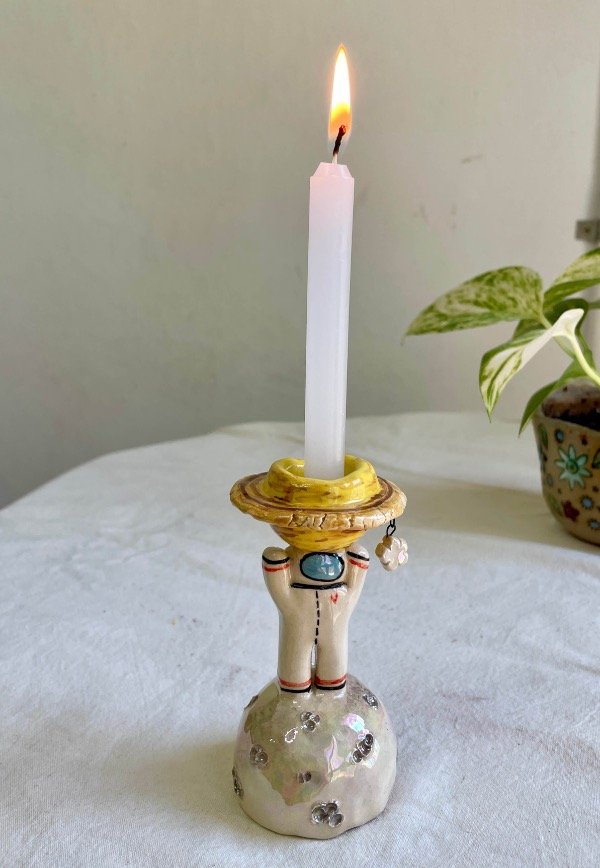 Candelabro de cerámica hecho y pintado a mano con engobes y lustre nacarado.