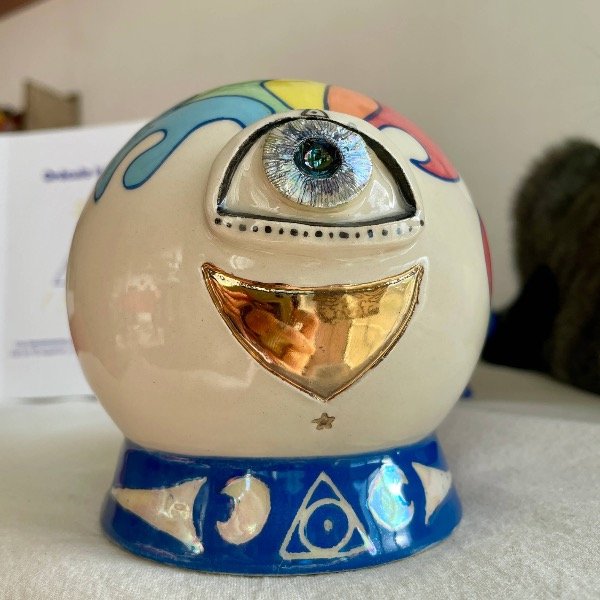 1 cuerpo de cerámica pintado a mano con engobes y lustre de oro y tornasol. Medidas aproximadas: 11x10cm.