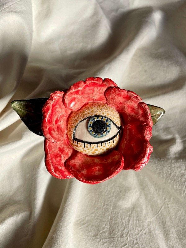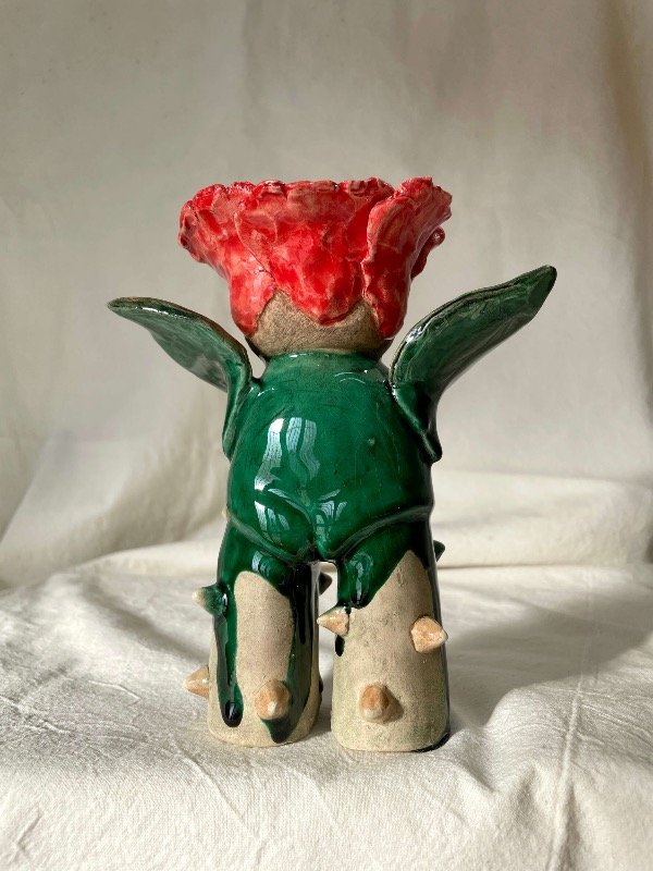 Escultura cerámica hecha y pintada a mano, decorada con pigmentos, engobes y esmaltes.