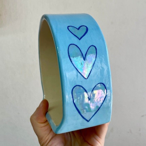 Realizado en cerámica, pintado a mano con engobes, esmalte y lustre de nácar.