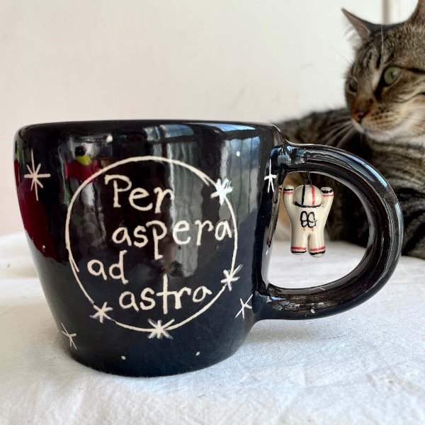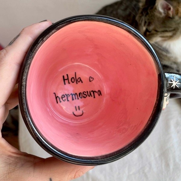 Taza de cerámica pintada con pigmentos, engobes, esmalte y lustre tornasolado